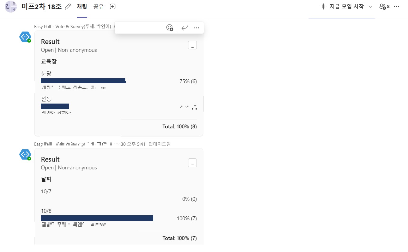 팀 구성 리스트가 뜨자마자!!!! 팀즈로 팀원들을 모아 투표를 진행했습니다 ㅎㅎ