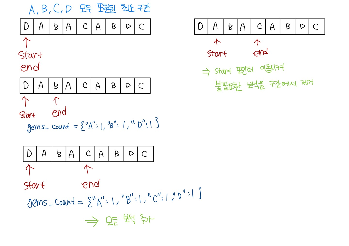 ex) 현재 gem_count에 DIA: 2가 있고, gems[end]가 DIA라면, gem_count = {"DIA": 3} - 없으면: 현재 구간에 처음으로 추가되는 것 -> 현재 구간에 이 보석의 개수를 1로 초기화