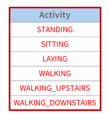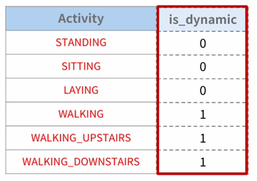 - 값 1 : WALKING, WALKING_UPSTAIRS, WALKING_DOWNSTAIRS