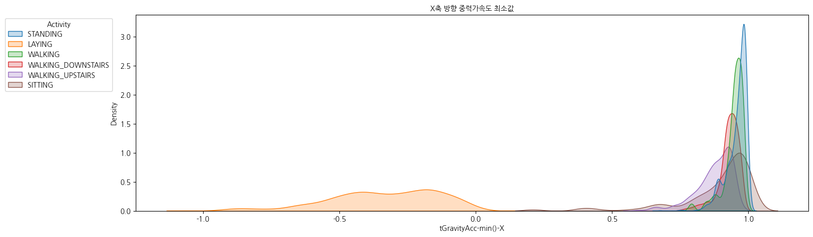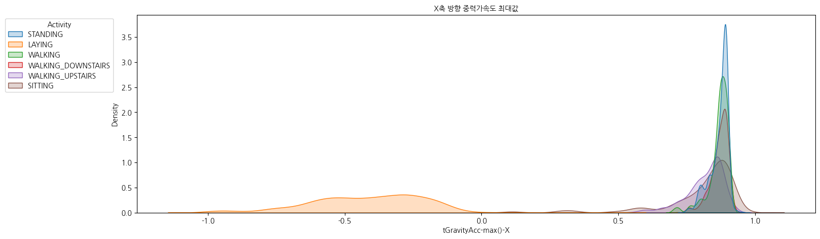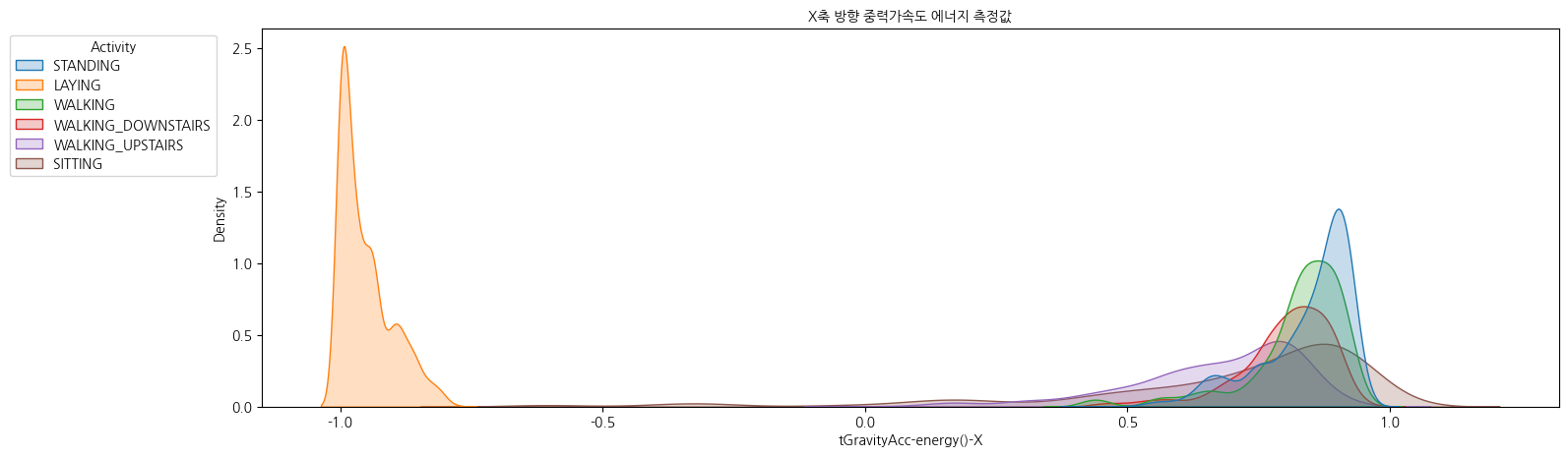 변수 분포가 명확하게 구분되는 경우가 많으며, 특히 X축의 중력가속도 변수들이 동적/정적 활동을 구별하는 데 중요한 역할을 할것이다.