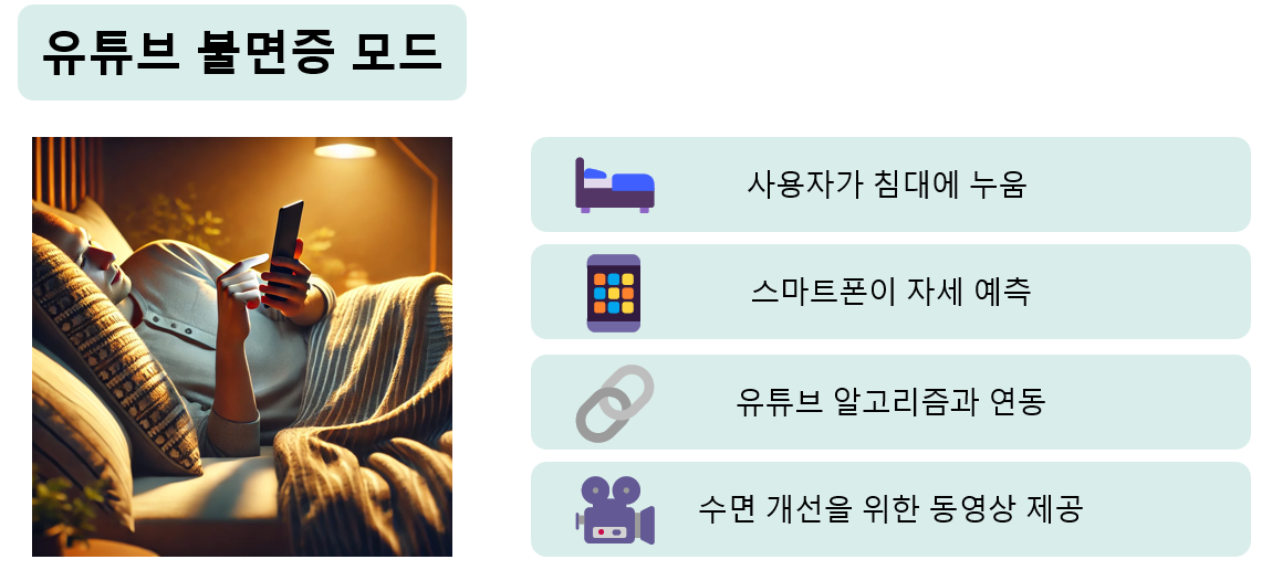 사용자가 침대에 누우면 스마트폰의 센서로 인식하고 사용자의 자세를 예측한다.