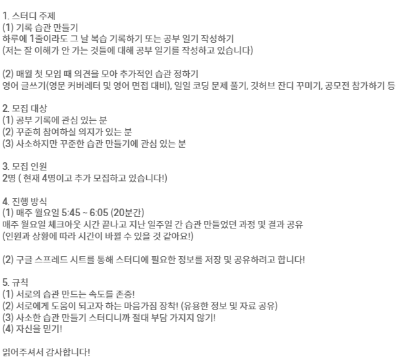 에듀홈(에이블에서 교육받는 웹사이트)에 스터디 그룹을 모집하는 카테고리가 있는데 거기서 구한 스터디에요!