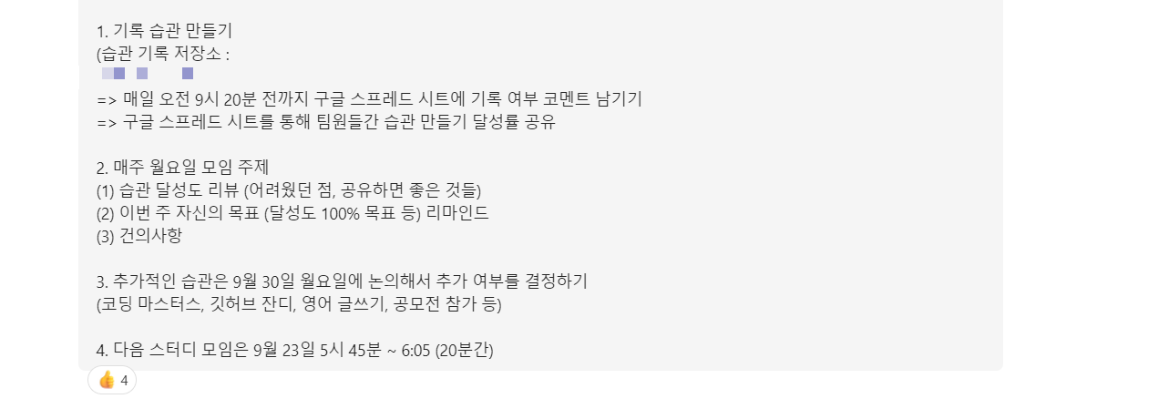 팀즈에서 진행하고 있고 매주 오전 9시 20분 전까지 기록했다는 코멘트를 구글 시트에 남기면