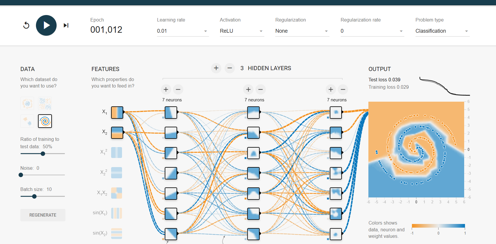 - 데이터셋 선택: 스파이럴(spiral), 정사각형 및 평면 회귀 문제 같은 여러 가지 기본 데이터셋을 제공한다.